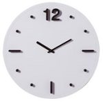 Stylish office wall clock in painted high tech polymer. The flat frameless face has embossed 20mm hour and minute indicators to make reading easier with number 12 indicated in numbers. The upper section at the back of the clock is fitted with a high tech polymer connection to connect to the wall. Hours and minute hands are in metal.
